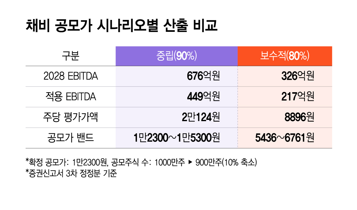 채비는 증권신고서를 최초 제출 이후 세차례 정정하면서 EBITDA(이자·세금·감가상각비 차감 전 영업이익) 등 실적 추정치를 하향 조정한 상태다. 다만 할인율을 낮추는 등 다른 변수도 조정하면서 공모가는 유지했다.
