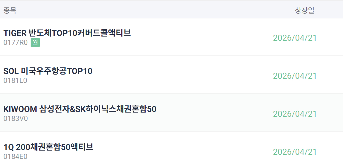이날 코스콤 ETF체크에 따르면 'SOL 미국우주항공TOP10(10,080원 ▲85 +0.85%)', 'TIGER 반도체TOP10커버드콜액티브(10,715원 ▲255 +2.44%)', 'KIWOOM 삼성전자&SK하이닉스채권혼합50(10,305원 ▲195 +1.93%)', '1Q 200채권혼합50액티브(10,130원 ▲130 +1.3%)'이 상장했다.