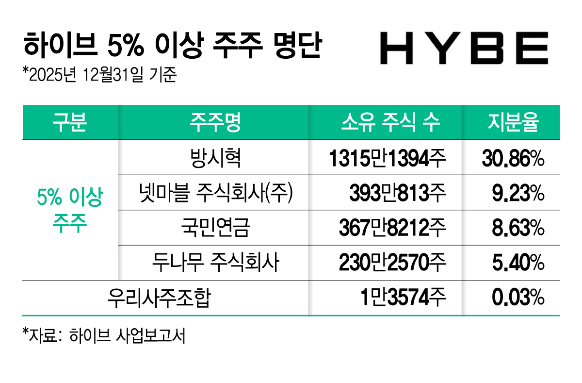 국민연금은 지난해 12월 말 기준 하이브에 대한 지분율이 8.63%로 방 의장(30.86%), 넷마블(9.23%)에 이은 3대 주주다. 2024년 7.54%에서 높아졌다. 2021년 5% 이상 보유 주주(5.11%)로 처음 신고한 뒤 지분율을 높여 왔다.
