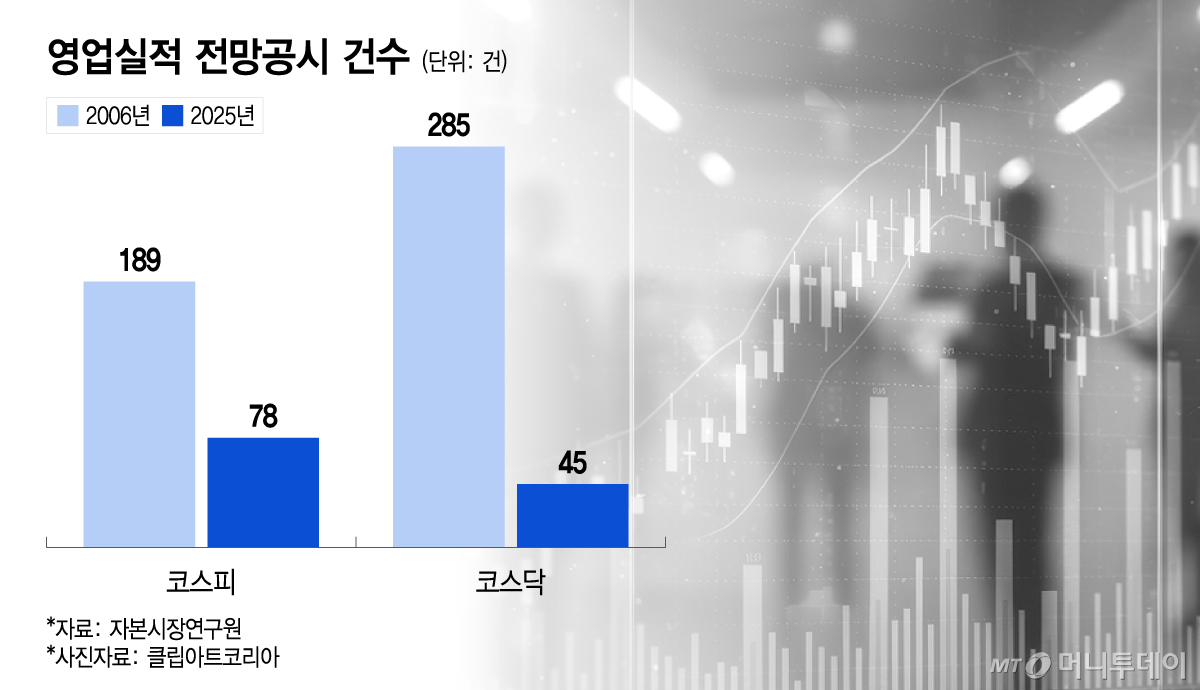 22일 자본시장연구원에 따르면 지난해 기준 영업실적 전망공시 건수는 코스피에서 78건, 코스닥에서 45건으로 조사됐다. 이는 2006년 코스피 189건, 코스닥 285건과 비교하면 각각 58%, 84% 이상 감소한 수준이다. 코스피와 코스닥을 모두 합하면 74% 줄었다.