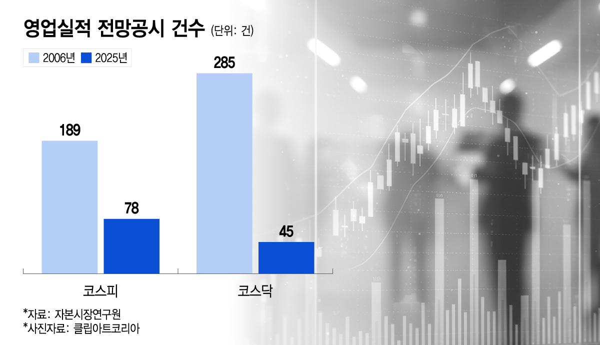 22일 자본시장연구원에 따르면 지난해 기준 영업실적 전망공시 건수는 코스피에서 78건, 코스닥에서 45건이다. 이는 2006년 코스피 189건, 코스닥 285건과 비교하면 각각 58%, 84% 이상 감소한 수준이다. 코스피와 코스닥을 합하면 이 기간에 74% 줄었다.