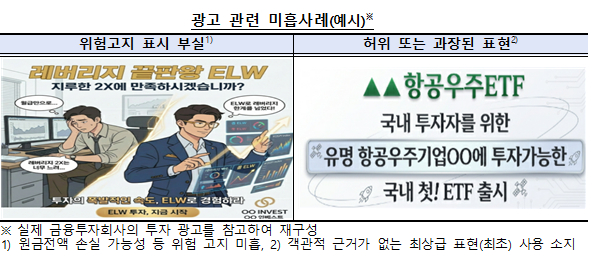 배당투자에 대해 "따박따박 월세 같은 돈을 받을 수 있는 방법이 있다"며 단정적인 표현을 사용하거나 커버드콜 ETF(상장지수펀드)를 소개하면서 '연 15% 프리미엄 수익 목표', '약 17% 분배율 기대' 등 실현되지 않은 목표수익율을 표시하는 식이다. 레버리지 상품 관련 원금전액 손실 가능성 위험을 알리지 않거나 '유명 항공우주기업OO에 투자가능한 국내 첫 ETF 출시' 등 객관적 근거가 없이 광고하는 사례도 지적됐다.