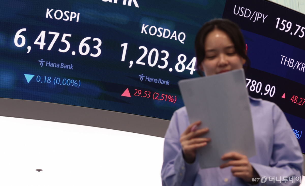 ![[서울=뉴시스] 이영환 기자 = 코스닥 지수가 전 거래일(1174.31)보다 29.53포인트(2.51%) 상승한 1203.84에 마감한 24일 오후 서울 중구 하나은행 딜링룸 전광판에 종가가 표시되어 있다. 코스피는 전 거래일(6475.81)보다 0.18포인트(0.00%) 내린 6475.63, 서울 외환시장에서 원·달러 환율은 전 거래일(1481.0원)보다 3.5원 오른 1484.5원에 주간 거래를 마감했다. 2026.04.24. 20hwan@newsis.com /사진=이영환](https://thumb.mt.co.kr/cdn-cgi/image/f=avif/21/2026/04/2026042611232474278_1.jpg)