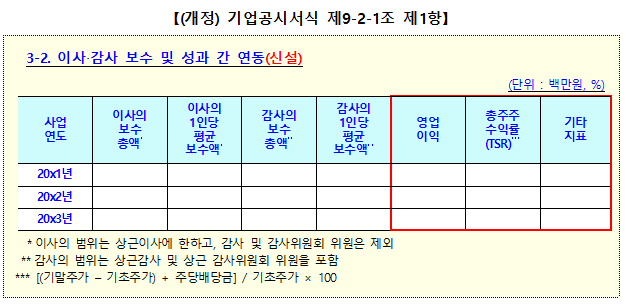 금감원이 마련한 공시서식 개정은 '임원의 보수 등' 항목에서 이사·감사의 보수총액을 기업성과 지표와 비교할 수 있도록 했다. 이사·감사의 보수총액과 1인당 평균 보수액을 공시할 때 영업이익, 총주주수익률(TSR) 등 성과지표를 함께 제시해야 한다.
