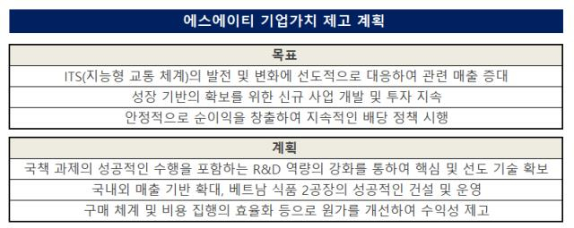 해당 제도가 처음 시행되는 해인 만큼 별도의 기업가치 제고 계획을 첨부하지 않고 목표와 계획을 간략히 공시하는 게 한시적으로 허용됐다. 에스에이티는 첫 공시를 통해 크게 △ITS(교통 관련 장비 제조·설치, 유지보수) 관련 매출 증대 △성장 기본 확보를 위한 신규 사업 개발·투자 △안정적 순이익 창출로 지속적인 배당 정책 시행 등을 목표로 제시했다.