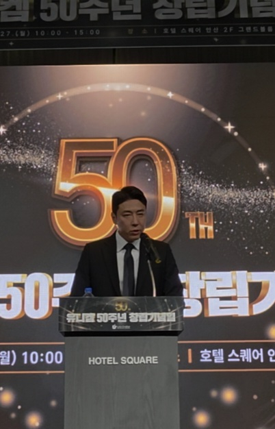 김진환 대표는 27일 오후 스퀘어 안산 호텔에서 열린 유니켐 창립 50주년 기념식에서 직접 차기 사업 비전을 발표했다. 비전 선포식은 이규창 유니켐 명예회장을 비롯해 각 사업부 임직원, 거래처 대표이사 및 임원들이 대거 참석한 자리에서 이뤄졌다.