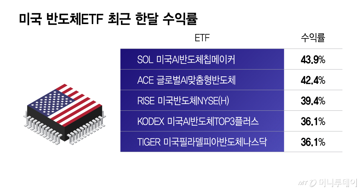 28일 금융투자업계에 따르면 최근 한달 간 SOL 미국AI반도체칩메이커 ETF의 수익률은 43.9%로 국내 상장 해외투자 ETF 가운데(레버리지 제외) 가장 높은 수익률을 기록했다. ACE 글로벌AI맞춤형반도체도 42.4% 수익률을 기록했고 RISE 미국반도체NYSE(H)와 RISE 미국반도체NYSE는 각각 39.4%, 36.2% 수익률을 나타냈다. KODEX 미국AI반도체TOP3플러스, TIGER 미국필라델피아반도체나스닥 등도 36% 수익률이다.