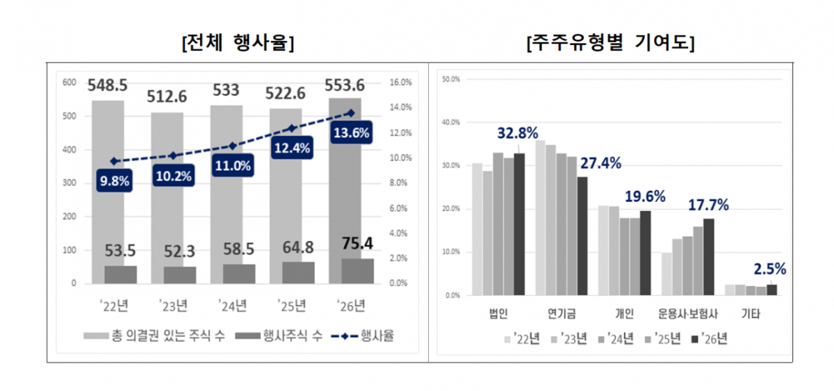 주주유형별 행사 기여도는 기관투자자(연기금·운용사·보험사)가 45.1%, 법인이 32.8%, 개인이 19.6%였다. 연기금의 경우 국민연금 등 7개 기관이 참여해 20억6000주를 행사했다.