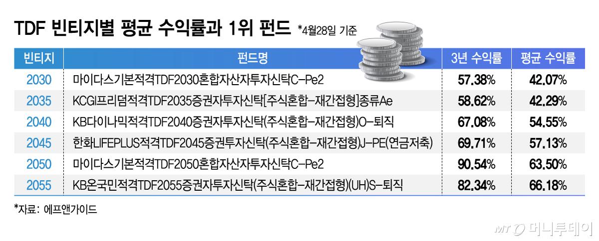 28일 금융정보업체 에프앤가이드에 따르면 이날 기준 TDF 2030의 3년 평균 수익률은 42.07%다. TDF는 투자자의 은퇴 예상 연도를 목표 시점으로 잡고 생애주기에 따라 자동으로 자산을 배분해주는 펀드다. 펀드명에 2030, 2035, 2040 등의 숫자가 붙는데 이는 은퇴 목표 시점을 의미한다.