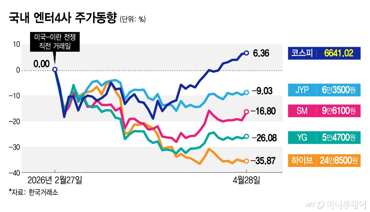 눈높이를 낮춘 배경엔 멀티플 하향이 있다. 역사적 신고가를 연일 새로 쓴 코스피 랠리가 반도체·산업재 중심으로 이어진 가운데 엔터업종 소외현상이 장기화하면서 증권가에선 선뜻 주가 낙관론을 펼치지 못하는 분위기다. 여기에 미국-이란 전쟁이 촉발한 국내외 증시 불확실성, 방탄소년단(BTS) 컴백과 맞물린 셀온(sell-on·호재 속 매도)은 투자부담을 가중한 요소로 거론된다.