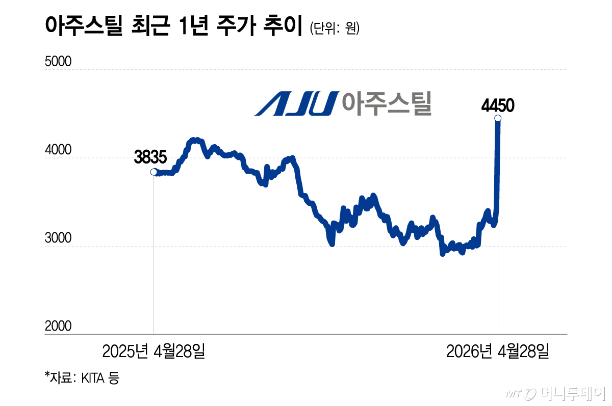 28일 한국거래소에 따르면 이날 아주스틸(4,450원 ▲1,025 +29.93%)은 전일대비 1025원(29.93%) 오른 4450원으로 거래를 마쳤다. 아주스틸은 사흘 연속 상승했고 이날 장 초반부터 가격제한선까지 올랐다.