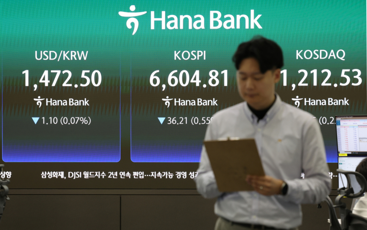 ![[서울=뉴시스] 조수정 기자 = 29일 오전 서울 중구 하나은행 딜링룸에서 전광판에 코스피 지수가 표시되고 있다. 29일 코스피는 전 거래일(6641.02)보다 22.02포인트(0.33%) 하락한 6619.00에 개장했다. 코스닥 지수는 전 거래일(1215.58)보다 2.30포인트(0.19%) 내린 1213.28에 거래를 시작했다. 서울 외환시장에서 원·달러 환율은 전 거래일 주간거래 종가(1473.6원)보다 0.4원 오른 1474.0원에 출발했다. 2026.04.29. chocrystal@newsis.com /사진=조수정](https://thumb.mt.co.kr/cdn-cgi/image/f=avif/21/2026/04/2026042911082646632_1.jpg)