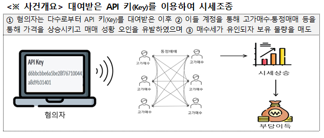 금융당국은 자동주문 수단인 API를 활용해 통정매매·고가매수 등 시세조종에 나선 혐의자를 잡아냈다. 혐의자는 일정 대가를 지불하고 여러 사람의 API 키(key)를 확보해 순차적으로 고가매수 주문을 넣어 가격을 올린 뒤 계좌 간 매수·매도를 주고받는 통정매매를 반복해 매매가 성황을 이루는 것처럼 꾸몄다. 이렇게 일반투자자 매수세가 들어오면 보유물량 대부분을 매도해 부당이득을 챙겼다.