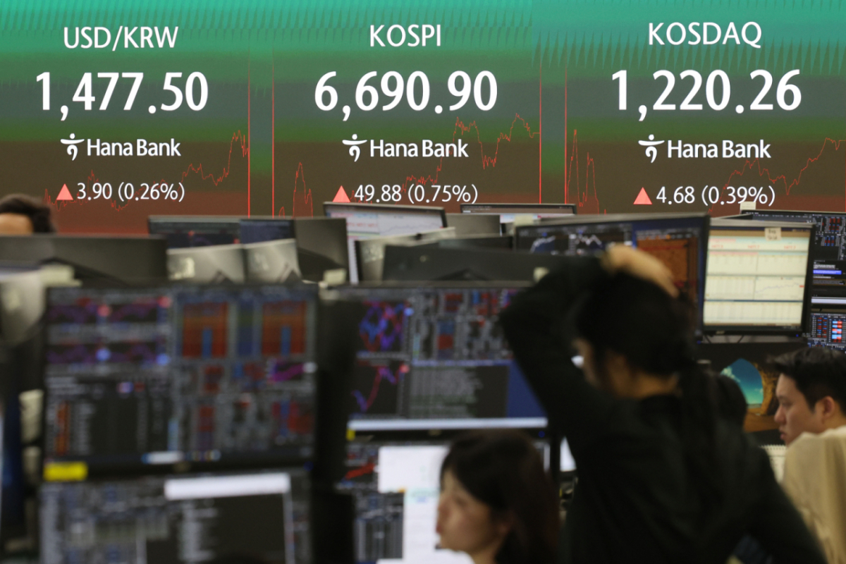 ![[서울=뉴시스] 권창회 기자 = 29일 오후 서울 중구 하나은행 딜링룸에서 딜러들이 업무를 보고 있다. 코스피가 전 거래일보다 49.88포인트(0.75%) 오른 6690.90에 마감했다. 코스닥 지수는 전 거래일보다 4.68포인트(0.39%) 상승한 1220.26, 원·달러 환율은 전 거래일보다 5.4원 오른 1479.0원에 마감했다. 2026.04.29. kch0523@newsis.com /사진=권창회](https://thumb.mt.co.kr/cdn-cgi/image/f=avif/21/2026/04/2026042916153843919_1.jpg)