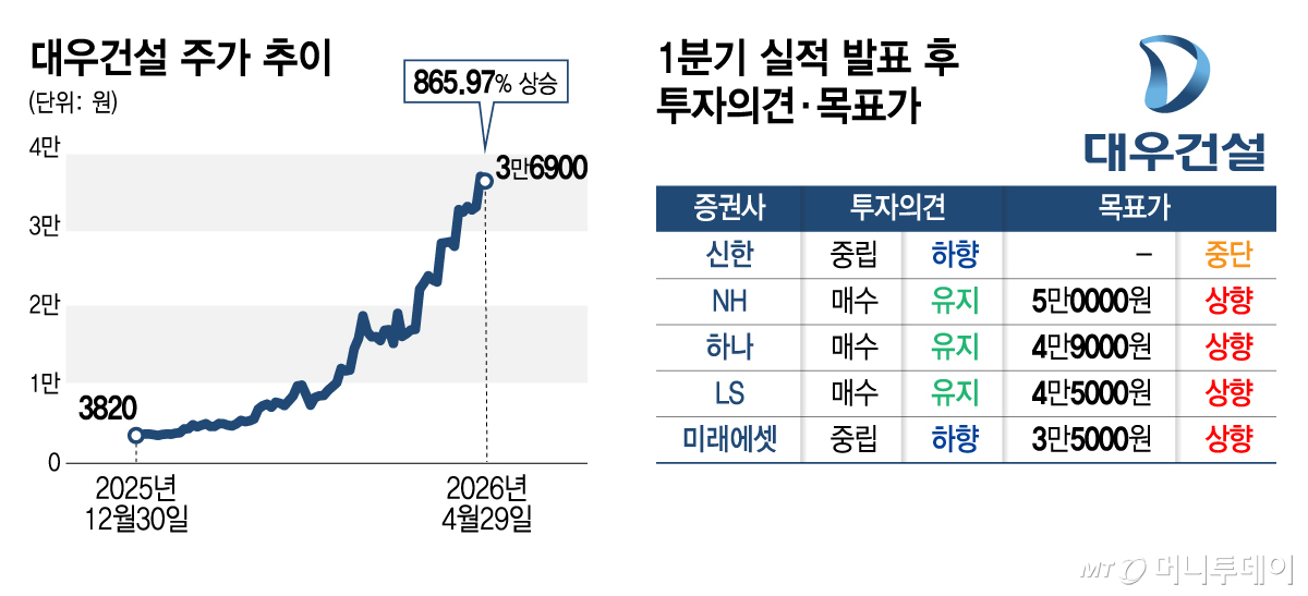 대우건설(36,900원 ▼250 -0.67%)이 기록적인 랠리를 이어가고 있다. 대규모 예상손실을 일거에 반영한 '빅배스'(Big Bath)와 해외 플랜트·원전 수주 기대감이 매수세를 유도했다.