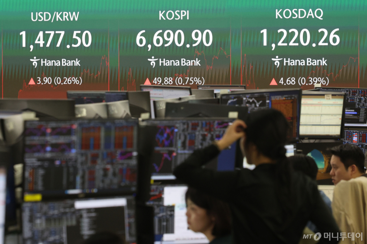 ![[서울=뉴시스] 권창회 기자 = 29일 오후 서울 중구 하나은행 딜링룸에서 딜러들이 업무를 보고 있다. 코스피가 전 거래일보다 49.88포인트(0.75%) 오른 6690.90에 마감했다. 코스닥 지수는 전 거래일보다 4.68포인트(0.39%) 상승한 1220.26, 원·달러 환율은 전 거래일보다 5.4원 오른 1479.0원에 마감했다. 2026.04.29. kch0523@newsis.com /사진=권창회](https://thumb.mt.co.kr/cdn-cgi/image/f=avif/21/2026/04/2026043008043038083_1.jpg)
