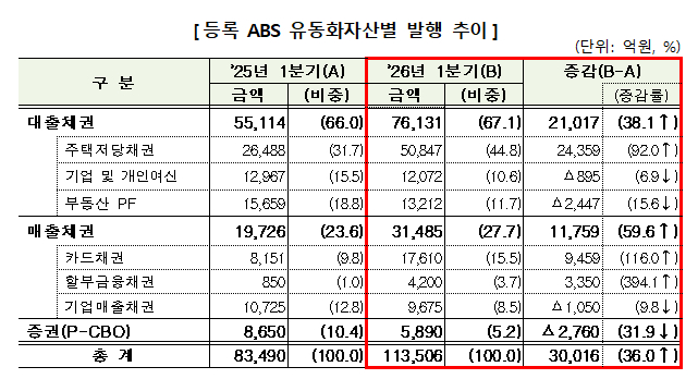 유동화 자산별로 보면 대출채권은 부동산PF(프로젝트 파이낸싱) 기초 ABS 발행 등은 감소했으나 MBS 발행이 증가하며 전년대비 38% 늘었다.
