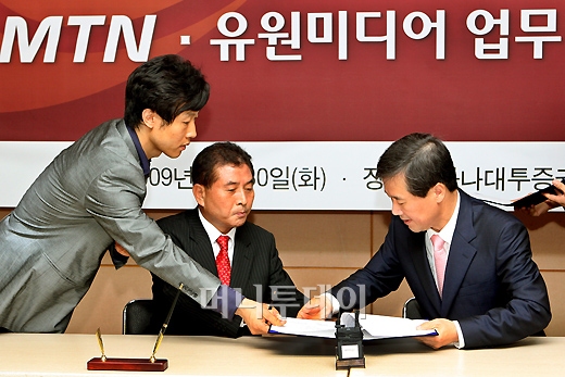 홍선근 머니투데이 대표(사진 오른쪽)와 조순용 지상파DMB특별위원장이 30일 오전 서울 여의도 하나대투증권빌딩 대회의실서 'MTN-유원미디어 업무협약 조인식'을 갖고 있다.