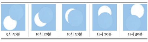 22일 오늘 오전 9시 무렵부터 정오까지 태양의 일부가 달에 가려지는 부분 일식의 장관이 전국에서 펼쳐진다.