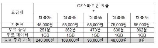 예컨대 월 1만원의 오즈스마트폰 요금제(1GB 데이터사용량 제공)와 251분의 무료 음성통화가 제공되는 더블 35요금제를 결합한 상품을 선택하면 월 4만5000원의 기본요금에 오즈옴니아를 24만원에 구입할 수 있다. 또 862분의 음성통화가 제공되는 더블75요금제를 선택하면 기본료 월 8만5000원에 단말기를 무료로 구입할 수 있다.