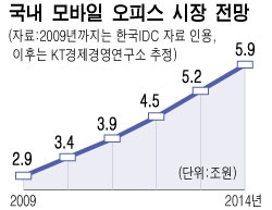 기업들이 속속 모바일 오피스를 도입하면서 관련 시장규모도 급속도로 성장할 전망이다. KT경제경영연구소는 2009년 2조9000억원 규모에 불과했던 국내 모바일 오피스 시장이 2014년 5조9000억원 규모로 확대될 것으로 추정했다.
