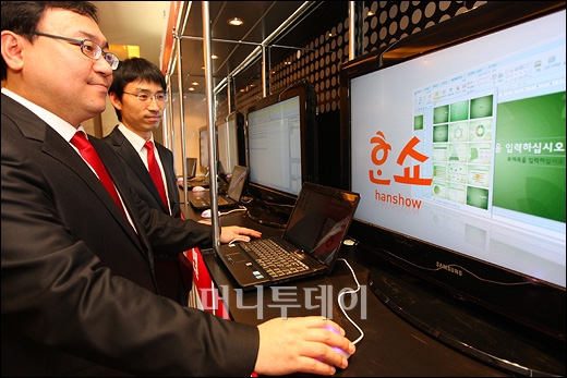 2일 오전 서울 소공동 프라자호텔에서 열린 한글과컴퓨터의 호환성과 사용성을 극대화한 '한컴오피스 2010' 출시회에 참석한 관계자들이 '한쇼'를 시연해보고 있다.