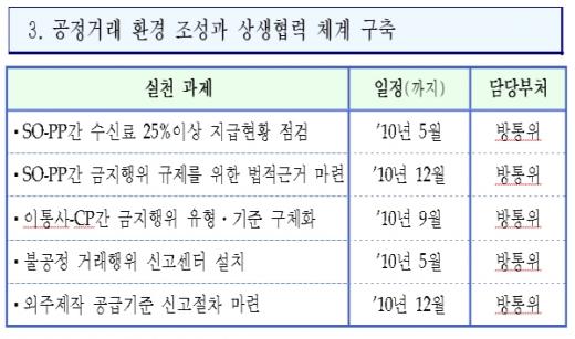 방통위는 케이블방송사와 채널사업자간 프로그램 공급 거래 개선을 위해 관련업체에 대한 서류 및 현장점검을 5월중 실시하고, 이동통신사와 모바일 콘텐츠업체간 공정한 수익배분을 위해 불공정한 수익배분 행위의 세부유형을 관련법령(전기통신사업법 시행령)에 구체화할 계획이다.