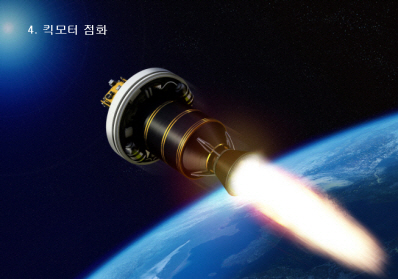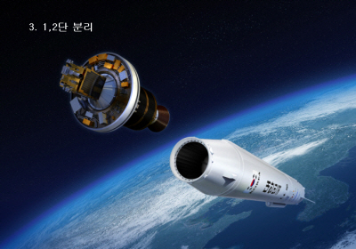 4. 발사 6분35초(395초)가 지나면 2단의 킥모터가 점화된다. 순수 국내 기술로 개발된 고체 액체 추진기관인 킥모터는 발사체 2단을 7분 33초(453초) 뒤 고도 300km 이상의 목표 궤도에 진입시킨다.