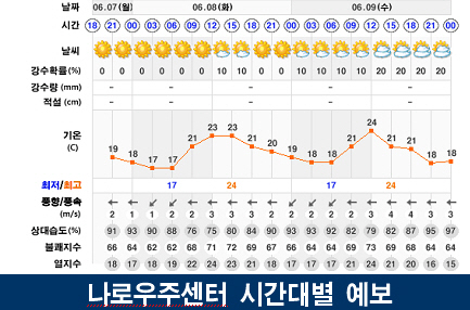 특히 나로호가 발사될 것으로 추측되는 오후 3시에서 6시 사이에는 구름이 많겠지만 강수확률은 20%로 낮다.