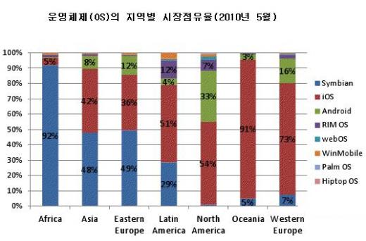 노키아의 심비안은 24%의 점유율로 3위를 기록했다. 동유럽(49%), 아시아(48%), 아프리카(92%)에서는 1위다.