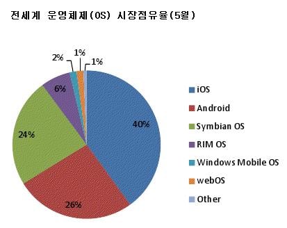 애플 iOS 40%, 안드로이드OS 26% 심비안 24% 순