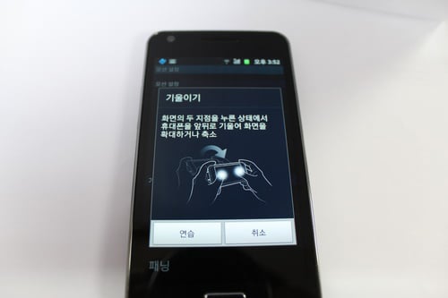 기울이기는 사용에 따라 꽤 편리한 기능이다. 화면의 두 지점을 터치한 상태로 폰을 앞뒤로 기울이면 화면을 확대하거나 축소하는 기능이다. 이 모션 기능은 사용자가 원하면 설정을 해지할 수 있다.