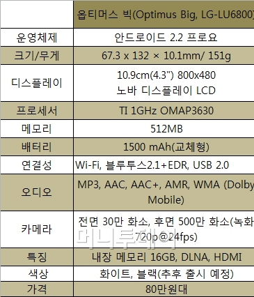 LG전자(112,500원 ▲6,900 +6.53%)(대표 구본준)는 ‘옵티머스 빅(LG-LU6800)’을LG유플러스(15,640원 ▲110 +0.71%)를 통해 출시한다고 1일 밝혔다.
