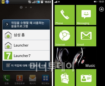 윈도폰처럼 바꾸는 일은 아주 간단하다. 마켓에서 무료로 내려 받을 수 있는 'Launcher7(런처7)'을 설치만 하면 된다. 설치 후 홈버튼을 누르면 어떤 홈화면으로 이동할지 선택을 하게 되는데 이 때 '런처7'을 선택해주자.