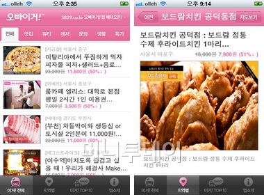 '오빠이거'는 소셜커머스 정보를 제공하는 앱이다. 티켓몬스터, 위메이크프라이스, 쿠팡, 지금샵 등 다양한 소셜커머스 사이트에서 50% 이상 할인되는 쿠폰을 소개하고 있다.