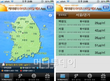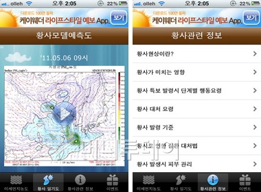 황사정보는 전국의 황사정보를 제공한다. 지도상의 점은 농도에 따라 색이 달라서 황사 농도가 어느 정도인지 쉽게 식별을 할 수 있다. 지도에서 지역을 선택하면 농도를 정확하게 확인해 볼 수 있다.