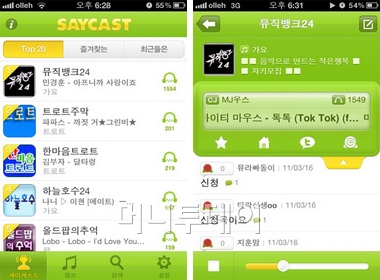 이 밖에도 '세이캐스트'에서는 벅스의 인기차트 20을 무료로 들을 수 있는 방법이 있다. 검색메뉴에서 특정 키워드로 검색을 하면 되는데 이는 앱소개 페이지를 참고하자.