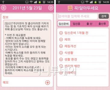 '꼭!알아두세요'는 임신 관련 각종 정보를 제공하는 메뉴이다. '맘스 Check!'는 임신관련 다양한 자가 진단 테스트를 제공한다. 우울증 진단, 체중 체크 등을 해볼 수 있다.