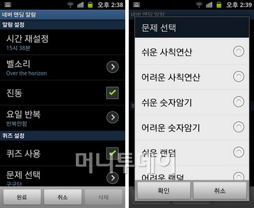 메뉴버튼을 눌러 알람을 추가하면서 문제풀이에 관한 설정도 같이 하게 된다. 알람 기능은 기본 알람과 거의 비슷해 큰 불편함이 없다. 문제설정에서는 문제의 종류와 몇 문제를 맞힐지를 정한다.
