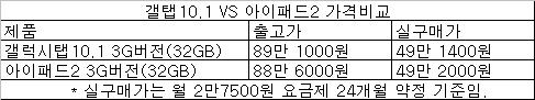 하지만 약정 보조금을 제한 실구매가는 갤럭시탭이 조금 더 싸다. 월 2만 7500원(데이터한도 2GB)인 '데이터평생 2G요금제'에 24개월 약정시 실구매가가 49만 1400원이다. 이는 아이패드2의 49만 2000원에비해 600원 정도 저렴한 것으로 사실상 동일 수준으로 책정한 것이다.