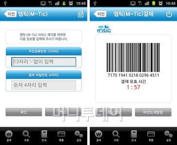'엠틱'은 휴대폰의 소액결제를 바코드로 할수 있게 해주는 앱으로 설치 후 간단한 인증절차만 거치면 바로 이용이 가능하다.
