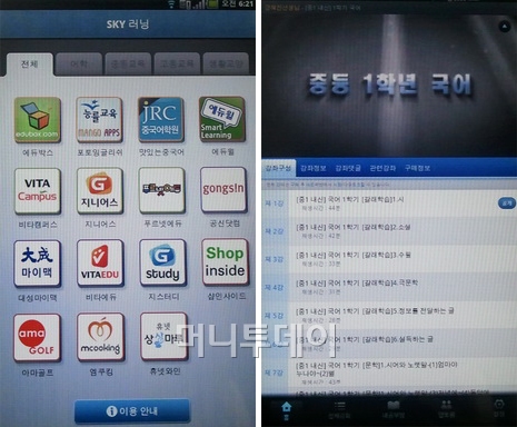 'SKY 러닝'에 들어가면 국내 유명 교육 사이트 15개의 정보를 볼 수 있다. 이 교육 사이트를 통해서 실시간으로 교육 콘텐츠를 제공 받을 수 있다. 기존에도 스마트폰에서 교육 콘텐츠를 볼 수 있었지만 5인치 화면으로 보는 것은 다양한 면에서 유리하다.