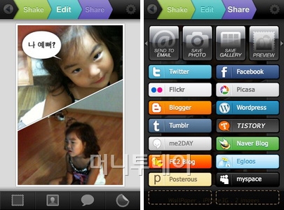 불러오기를 완료 했다면 폰을 가볍게 흔들어 보자. 자동으로 하나의 사진으로 만들어 준다. 마음에 들지 않는다면 다시 흔들면 또 다른 모양의 사진으로 만들어 준다. 이렇게 만들어진 사진에 추가편집이 가능하다. 말풍선이나 스티커를 넣을 수 있고 사진에 효과를 줄 수도 있다.