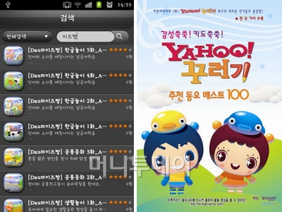 '다음 키즈짱' 역시 아이들을 위한 앱으로 한글놀이, 공룡동화, 지능놀이 등 다양한 놀이가 들어가 있는 앱이다. 시리즈 앱으로 여러 개를 미리 내려 받아 두어야 한다. 마지막으로 '야후 꾸러기 동요, 동화'는 유명한 동요와 동화가 들어가 있어 아이들의 시선을 사로잡는다. 칭얼대는 아이의 소리가 괴롭다면 이 앱을 이용해보자.