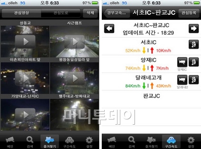 즐겨찾기는 사용자가 자주 확인하는 CCTV와 관심도로를 볼 수 있는 메뉴로 CCTV는 최대 24개 관심도로는 20개까지 등록이 가능하다. 구간속도는 텍스트 기반으로 상행과 하행의 평균 속도를 보여준다. 마지막으로 설정에서는 유가, 교통 정보에 대한 간단한 설정을 변경할 수 있다.