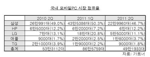 반면 HP, 애플 등 외산기업들은 뚜렷한 약진세를 보였다. HP는 탄탄한 기업용(B2B) 시장을 기반으로 시장 점유율면에서 LG전자를 제치고 시장 2위 자리를 꿰찼다. HP는 2분기 6만대의 노트북을 판매하며 12.2%를 점유율 기록했다. 전 분기 점유율 7.2%에서 5.0%포인트 높아진 것.