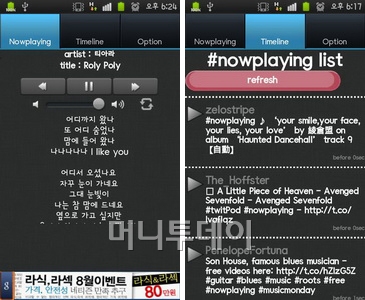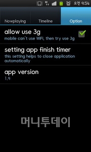 타임라인은 무작위로 나오는 노래가 듣기 싫을 때 이용하는 메뉴로 나우플레잉 해쉬태그가 들어간 트윗 중에서 마음에 드는 것을 선택해 재생하는 메뉴이다. 마지막으로 옵션에는 3G데이터 사용여부와 자동종료 시간을 설정할 수 있다.