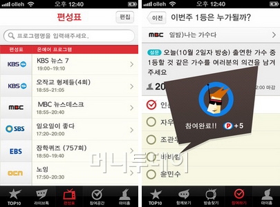 라이브톡은 실시간으로 올라오는 사용자들의 톡을 프로그램 구분 없이 볼 수 있다. 편성표에서는 지상파와 인기 케이블 채널의 편성표를 제공하고 프로그램 검색도 가능하다. 참여공간은 특정 프로그램에 대한 퀴즈를 맞추거나 설문조사에 참여하는 메뉴로 참여 할 때마다 포인트를 획득할 수 있다.