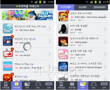 '추천앱'은 카테고리별로 괜찮은 앱을 모아둔 메뉴로 자신이 원하는 분야의 앱을 쉽게 찾아 볼 수 있는 메뉴이다. '테마'는 일반적인 분류가 아니고 다양한 상황에 따라 앱을 소개한다.