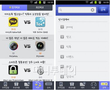 '비교'는 비슷한 기능을 가진 앱을 선정해 각 특징을 비교해 보여주는 메뉴이다. 인기 있는 앱은 비슷한 것이 많기에 어떤 선택에 대한 고민이 있다면 이 메뉴를 이용하면 된다. 마지막으로 '검색'은 웹 검색이 아닌 앱 검색이다. 자신이 찾는 앱의 이름을 넣으면 된다.